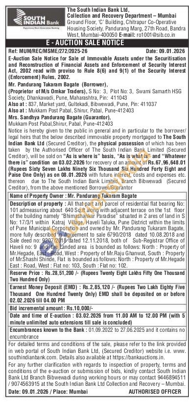 All that part and parcel of residential flat bearing No: 101 admeasuring about 640 Sq.ft along with adjacent terrace on the 1st floor of the building namely "Bhimashankar Paradise" situated in 2 ares of land in S No: 17/3/1 within Katraj Village, Haveli Taluka, Pune District within the limits of Pune Municipal Corporation and owned by Mr. Pandurang Tukaram Bagate, more fully described in Agreement to sale 6790/2018 dated 10.08.2018 and Sale deed no: 9207/2018 dated 12.11.2018, both of Sub-Registrar Office of Haveli no: 9 and the Landed area is bounded as follows: North: Property of Mr.Hegade, East: Road, West: Property of Mr. Raju Ghanwat, South: Property of Mr.Shashi Shinde, Flat is bounded as follows: North: Property of Mr.Hegade East: Road, West: Flat no: 103, South: Flat no: 102.