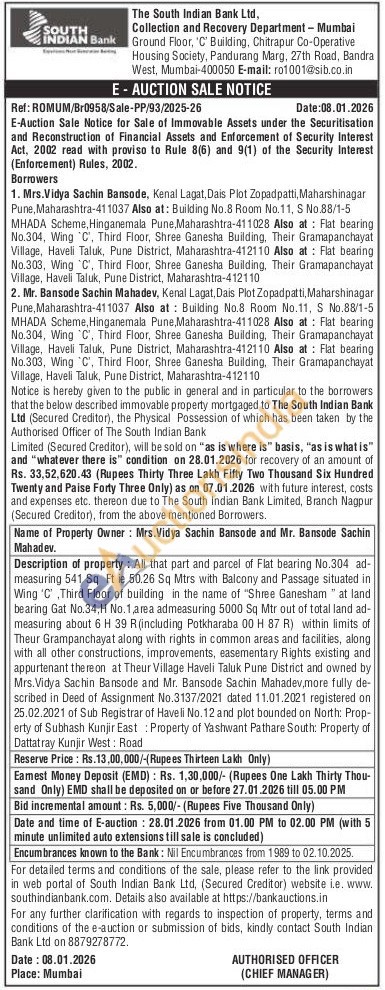 Description of property: All that part and parcel of Flat bearing No.304 ad-measuring 541 Sq Ft ie 50.26 Sq Mtrs with Balcony and Passage situated in Wing 'C' Third Floor of building in the name of "Shree Ganesham " at land bearing Gat No.34,H No.1, area admeasuring 5000 Sq Mtr out of total land ad-measuring about 6 H 39 R (including Potkharaba 00 H 87 R) within limits of Theur Grampanchayat along with rights in common areas and facilities, along with all other constructions, improvements, easementary Rights existing and appurtenant thereon at Theur Village Haveli Taluk Pune District and owned by Mrs. Vidya Sachin Bansode and Mr. Bansode Sachin Mahadev, more fully de-scribed in Deed of Assignment No.3137/2021 dated 11.01.2021 registered on 25.02.2021 of Sub Registrar of Haveli No. 12 and plot bounded on North: Prop-erty of Subhash Kunjir East Property of Yashwant Pathare South: Property of Dattatray Kunjir West: Road