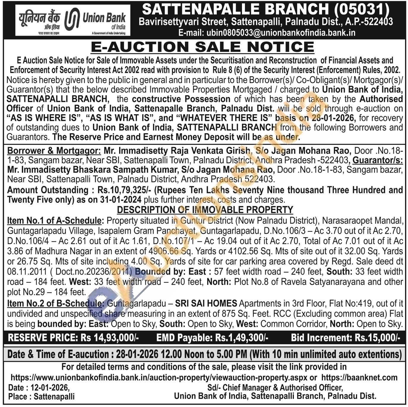 Item No.1 of A-Schedule: Property situated in Guntur District (Now Palnadu District), Narasaraopet Mandal, Guntagarlapadu Village, Isapalem Gram Panchayat, Guntagarlapadu, D.No. 106/3 - Ac 3.70 out of it Ac 2.70, D.No.106/4-Ac 2.61 out of it Ac 1.61, D.No. 107/1 Ac 19.04 out of it Ac 2.70, Total of Ac 7.01 out of it Ac 3.86 of Madhura Nagar in an extent of 4906.66 Sq. Yards or 4102.56 Sq. Mts of site out of it 32.00 Sq. Yards or 26.75 Sq. Mts of site including 4.00 Sq. Yards of site for car parking area covered by Regd. Sale deed dt 08.11.2011 (Doct.no.20236/2011) Bounded by: East: 57 feet width road - 240 feet, South: 33 feet width road 184 feet. West: 33 feet width road - 240 feet, North: Plot No.8 of Ravela Satyanarayana and other plot No.29-184 feet. Item No.2 of B-Schedule: Guntagarlapadu - SRI SAI HOMES Apartments in 3rd Floor, Flat No:419, out of it undivided and unspecified share measuring in an extent of 875 Sq. Feet. RCC (Excluding common area) Flat is being bounded by: East: Open to Sky, South: Open to Sky, West: Common Corridor, North: Open to Sky