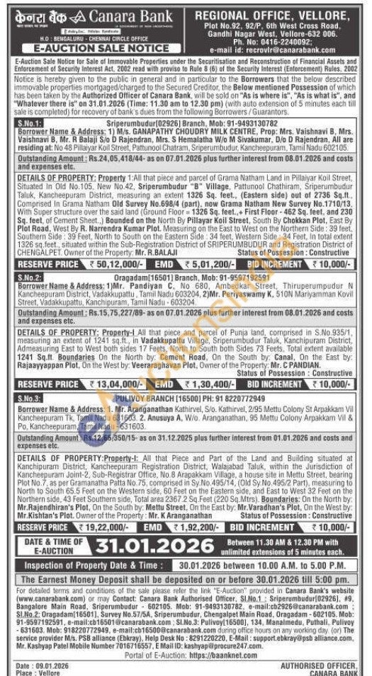 DETAILS OF PROPERTY: Property-k: All that Piece and Part of the Land and Building situated at Kanchipuram District, Kancheepuram Registration District, Walajabad Taluk, within the Jurisdiction of Kancheepuram Joint-2, Sub-Registrar Office, No.8 Arapakkam Village, a house site in Mettu Street, bearing Plot No.7, as per Gramanatha Patta No.75, comprised in Sy.No.495/14, (Old Sy No. 495/2 Part), measuring to North to South 65.5 Feet on the Western side, 60 Feet on the Eastern side, and East to West 32 Feet on the Northern side, 43 Feet Southern side, Total area 2367.2 Sq. Feet (220 Sq.Mtrs) Boundaries: On the North by: Mr.Rajendhiran's Plot, On the South by: Mettu Street. On the East by: Mr. Varadhan's Plot, On the West by Mr.Kishtan's Plot. Owner of the Property: Mr. K Aranganathan