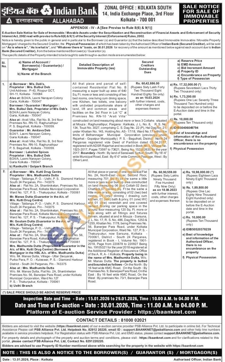 All that piece or parcel of one residential Flat No. 2A, North-East corner, Second Floor, measuring 701 Sq. Fl be the same a little more or less super built up area constructed on land measuring 06 (six) Cottah 02 (two) Chattack 07 (seven) Sq. Ft be the same a Ettle more or less, consisting of 02 (two) bed rooms. 01 (one) dinning / drawing cum kitchen, 01 (one) bath & privy 01 (one) WC and 01 (one) verandah and one covered cement flooring car parking space in the ground floor measuring 120 Sq. Ft. more or less along with all fittings and fixtures therein, situated at and in Mouza-Sarsuna, J. L. No. 17, R. S. No. 486, Dag Nos, 1253 & 1255, Khatian No. 1178, being Premises No. 56, Banerjee Para Road, under Kolkata Municipal Corporation, Ward No. 127, P. S.-Thakurpukur, now Sarsuna, Kolkata 700061, District South 24 Parganas, registered tered in Book I, Volume No. 1901-2018. Page from 220878 to 220927 Being No. 19105321 for the year 2018 registered at the Additional Registrar of Assurance Office of the A. R.A- Kolkata Property being in the name of Mrs. Madhumita Dutta, Wio. Mr. Manas Dutta. The property is butted and bounded as follows-On the North: By 16 feet wide KMC Road, On the South By Premises No. 9. Banerjee Para Road. Onthe East: By 16 feet wide KMC Road, On the West: By premises No. 73/1, Banerjee Para Road.