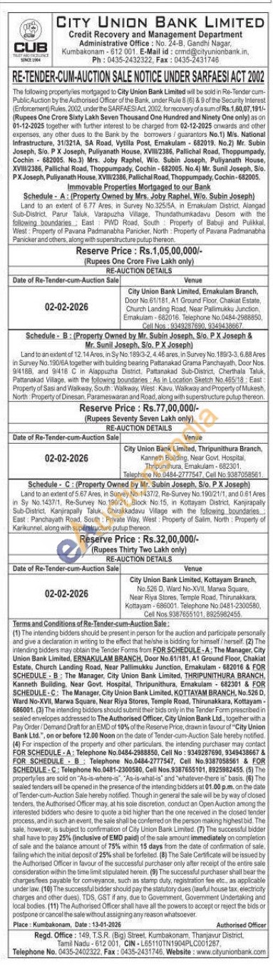 2) Land to an extent of 12.14 Ares, in Sy No. 189-3-2,446 ares, in Survey No. 1893-36.88 Ares in Survey No. 19016A together with building bearing Pattanakad Grama Panchayath, Door Nos 9/4188 and 9/416 C in Alappuzha District, Pattanakad Sub-Disanct, Cherthala Taluk Pattanakad Village, with the following boundaries. As in Location Sketch No.465/18 East: Property of Sasi and Walkway, South Walkway, West Kavu, Walkway and Property of Mukesh North Property of Dinesan, Parameswaran and Road, along with superstructure putup thereon.