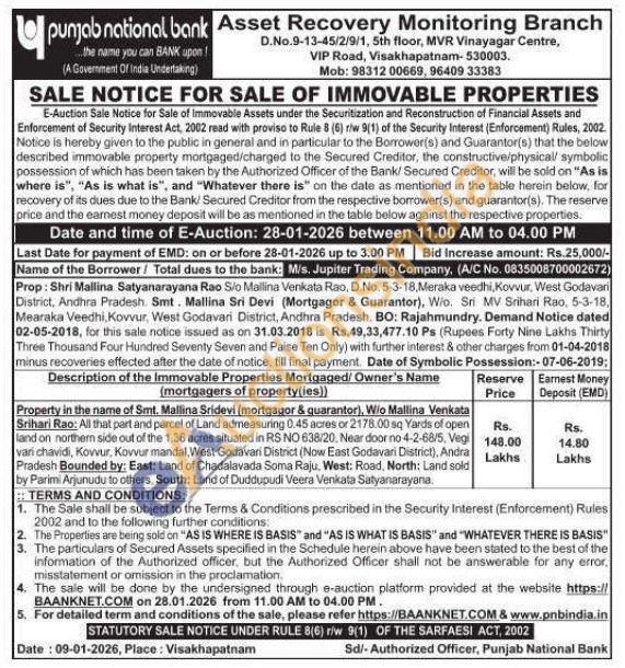 Property in the name of Smt. Mallina Sridevi (mortgagor & quarantor), W/o Mallina Venkata Srihari Rao: All that part and parcel of Land admeasuring 0.45 acres or 2178.00 sq Yards of open land on northern side out of the 1.36 acres situated in RS NO 638/20, Near door no 4-2-68/5, Vegi vari chavidi, Kovvur, Kovvur mandal, West Godavari District (Now East Godavari District), Andra Pradesh Bounded by: East: Land of Chadalavada Soma Raju. West: Road, North: Land sold by Parimi Arjunudu to others, South: Land of Duddupudi Veera Venkata Satyanarayana