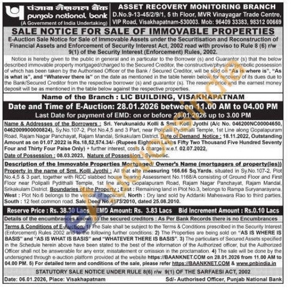Description of the Immovable Properties Mortgaged/ Owner's Name (mortgagers of property(ies)) Property in the name of Smt. Kolli Jyothi: All that site measuring 166.66 Sq. Yards. situated in Sy.No. 107-2. Plot No.4,5 & 3 part, together with RCC slabbed house bearing Assessment No. 1168/A consisting of Ground Floor and First Floor near Polipalli Pydithalli Temple, 1st line along Gopalapuram Road, Rajam Nagar Panchayat, Rajam Mandal, Srikakulam District Boundaries of the Property; East: Remaining land in Plot No.3, belongs to Rampa Suryanarayana. West: Plot No 6 belongs to the vendor of applicant, North: Dry land sold by Addanki Maheswara Rao to third parties, South: 12 feet common road. Sale Deed No.4173/2010, dated 25.08.2010.