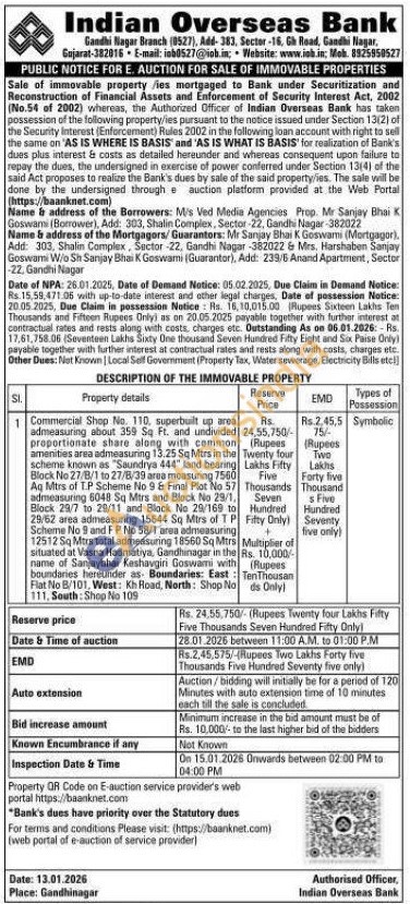 Commercial Shop No. 110, superbuilt up area admeasuring about 359 Sq Ft. and undivided proportionate share along with common amenities area admeasuring 13.25 Sq Mtrs in the scheme known as "Saundrya 444" land bearing Block No 27/8/1 to 27/8/39 area measuring 7560 Ag Mtrs of T.P Scheme No 9 & Final Plot No 57 admeasuring 6048 Sq Mtrs and Block No 29/1, Block 29/7 to 29/11 and Block No 29/169 to 29/62 area admeasuring 15644 Sq Mtrs of TP Scheme No 9 and FP No 58/1 area admeasuring 12512 Sq Mtrs total admeasuring 18560 Sq Mtrs situated at Vasna Hadmatiya, Gandhinagar in the name of Sanjaybhai Keshavgiri Goswami with boundaries hereunder as Boundaries: East: Flat No B/101, West: Kh Road, North: Shop 111, South: Shop No 109