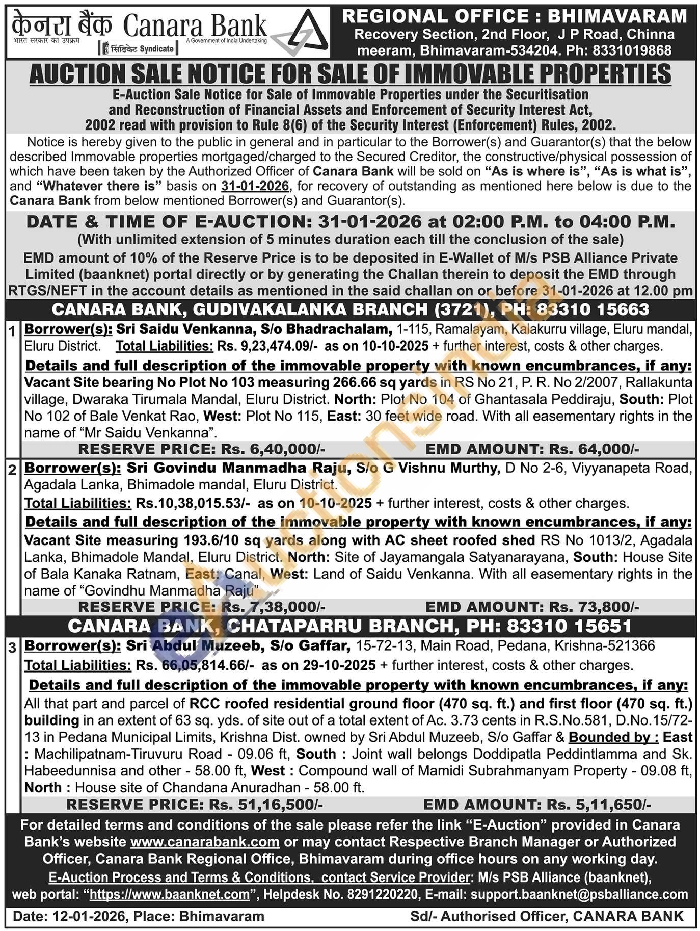Details and full description of the immovable property with known encumbrances, if any: All that part and parcel of RCC roofed residential ground floor (470 sq. ft.) and first floor (470 sq. ft.) building in an extent of 63 sq. yds. of site out of a total extent of Ac. 3.73 cents in R.S.No.581, D.No. 15/72-13 in Pedana Municipal Limits, Krishna Dist. owned by Sri Abdul Muzeeb, S/o Gaffar & Bounded by: East : Machilipatnam-Tiruvuru Road 09.06 ft, South Joint wall belongs Doddipatla Peddintlamma and Sk. Habeedunnisa and other - 58.00 ft, West: Compound wall of Mamidi Subrahmanyam Property - 09.08 ft, North: House site of Chandana Anuradhan - 58.00 ft.