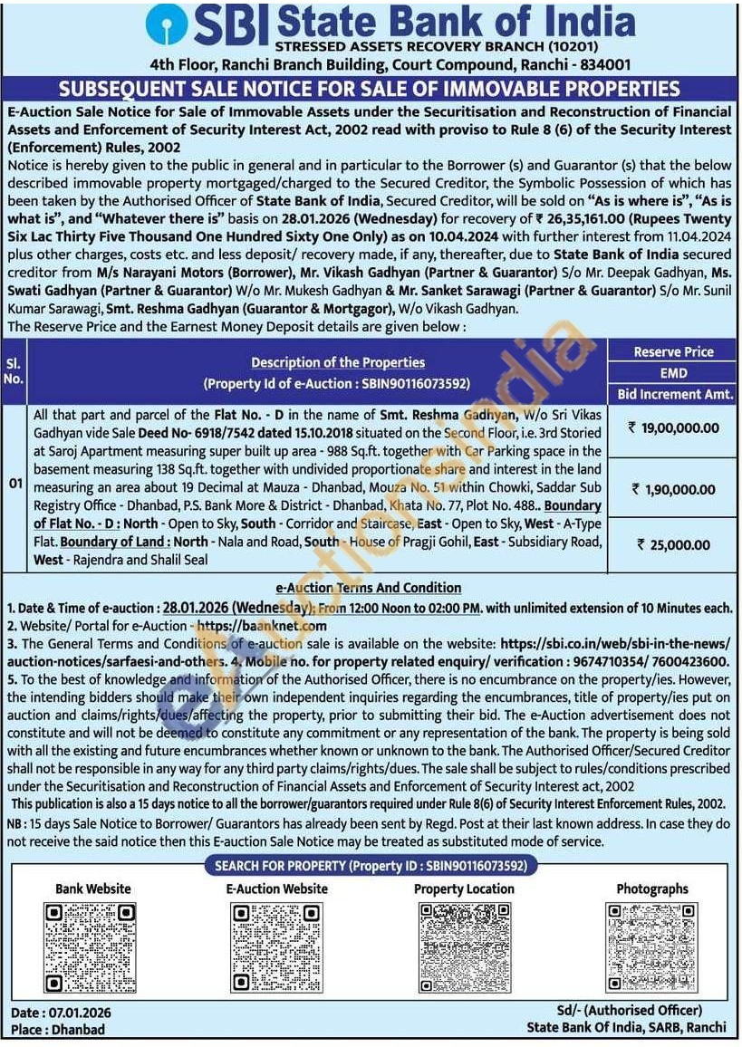All that part and parcel of the Flat No. D in the name of Smt. Reshma Gadhyan, W/o Sri Vikas Gadhyan vide Sale Deed No- 6918/7542 dated 15.10.2018 situated on the Second Floor, i.e. 3rd Storied at Saroj Apartment measuring super built up area - 988 Sq.ft. together with Car Parking space in the basement measuring 138 Sq.ft. together with undivided proportionate share and interest in the land measuring an area about 19 Decimal at Mauza - Dhanbad, Mouza No. 51 within Chowki, Saddar Sub Registry Office - Dhanbad, P.S. Bank More & District - Dhanbad, Khata No. 77, Plot No. 488.. Boundary of Flat No. - D: North - Open to Sky, South - Corridor and Staircase, East - Open to Sky, West - A-Type Flat. Boundary of Land: North - Nala and Road, South - House of Pragji Gohil, East - Subsidiary Road, West-Rajendra and Shalil Seal