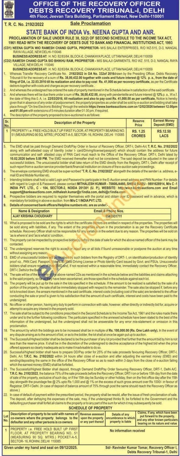 PROPERTY i.e. FREE HOLD BUILT UP FIRST FLOOR, AT PROPERTY BEARING NO. 51 (MEASURING 90 SQ. MTRS.) POCKET-A-5, SECTOR-16, ROHINI, DELHI 110085