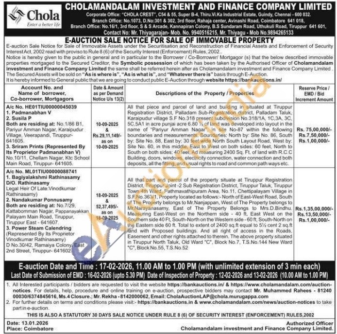 All that part and parcel of the property situate at Tiruppur Registration District, Tiruppur Joint -2 Sub Registration District, Tiruppur Taluk, Tiruppur Town 4th Ward, Pathmavathipuram Area, No. 11, Chettipalayam Village in S.F.No.363/1, Property located as follows:-North of East-West Road, South of The Property belongs to Mr. Nanjappan, West of The Property belongs to Mr.Narayanasamy. East of The Property Belongs to Mrs.D.Bindhu. Measuring East-West on the Northern side 40 ft. East West on the Southern side 40 Ft, South-North on the Westem side-60 ft, South-North on the Eastem side 60 ft. Total to extent of 2400 sq.ft equal to 5% cent 2 sq.ft land with Proposed buildings. And all right of access in the Roads. Easement and other rights attached to therein. The above property situated in Tiruppur North Taluk, Old Ward "C", Block No.7, T.S.No.144 New Ward "C", Block No.55, T.S.No 52