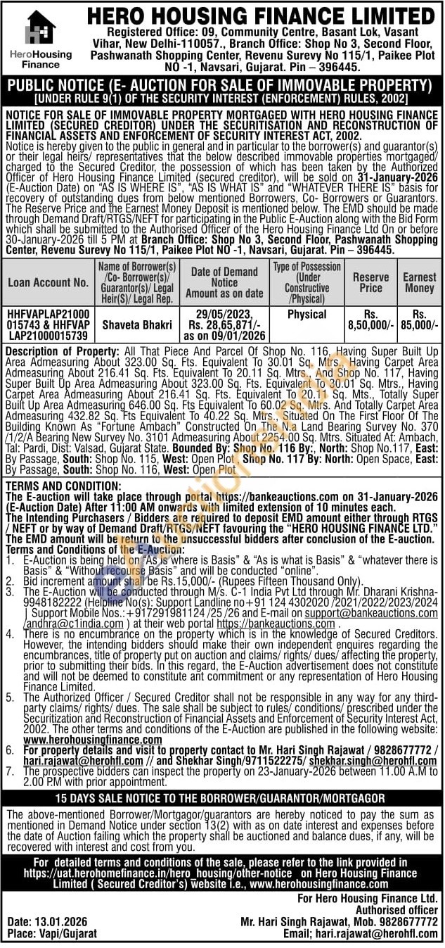 Description of Property: All That Piece And Parcel Of Shop No. 116, Having Super Built Up Area Admeasuring About 323.00 Sq. Fts. Equivalent To 30.01 Sq. Mtrs., Having Carpet Area Admeasuring About 216.41 Sq. Fts. Equivalent To 20.11 Sq. Mtrs., And Shop No. 117. Having Super Built Up Area Admeasuring About 323.00 Sq. Fts. Equivalent To 30.01 Sq. Mtrs., Having Carpet Area Admeasuring About 216.41 Sq. Fts. Equivalent To 20.11 Sq. Mts. Totally Super Built Up Area Admeasuring 646.00 Sq. Fts Equivalent To 60.02 Sq. Mtrs. And Totally Carpet Area Admeasuring 432.82 Sq. Fts Equivalent To 40.22 Sq. Mtrs., Situated On The First Floor Of The Building Known As "Fortune Ambach" Constructed On The N.a Land Bearing Survey No. 370 /1/2/A Bearing New Survey No. 3101 Admeasuring About 2254.00 Sq. Mtrs. Situated At: Ambach, Tal: Pardi, Dist: Valsad, Gujarat State. Bounded By: Shop No. 116 By:, North: Shop No.117. East: By Passage, South: Shop No. 115, West: Open Plot, Shop No. 117 By: North: Open Space, East: By Passage, South: Shop No. 116, West: Open Plot