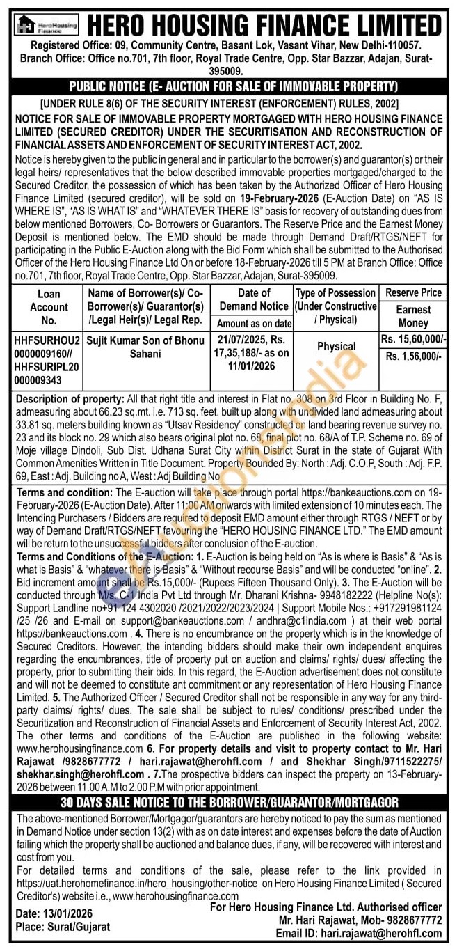 Description of property: All that right title and interest in Flat no. 308 on 3rd Floor in Building No. F. admeasuring about 66.23 sq.mt. i.e. 713 sq. feet. built up along with undivided land admeasuring about 33.81 sq. meters building known as "Utsav Residency" constructed on land bearing revenue survey no. 23 and its block no. 29 which also bears original plot no. 68, final plot no. 68/A of T.P. Scheme no. 69 of Moje village Dindoli, Sub Dist. Udhana Surat City within District Surat in the state of Gujarat With Common Amenities Written in Title Document. Property Bounded By: North: Adj. C.O.P, South: Adj. F.P. 69, East: Adj. Building no A, West: Adj Building No