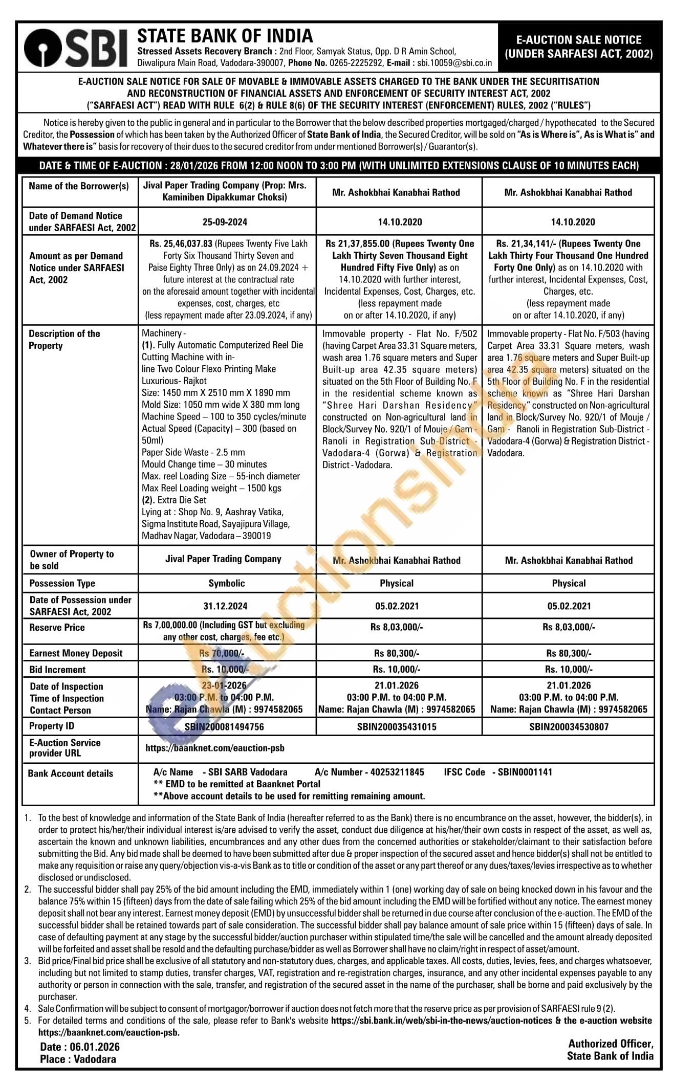 Immovable property Flat No. F/503 (having Carpet Ares 33.31 Square meters, wash area 1,76 square meters and Super Built-up area 42.35 square meters) situated on the 5th Floor of Building No. F in the residential scheme known as "Shree Hari Darshan Residency constructed on Non-agricultural land in Block/Survey No. 920/1 of Mouje/Gam Ranoli in Registration Sub-District-Vadodara 4 (Gorwa) e Registration District Vadodara