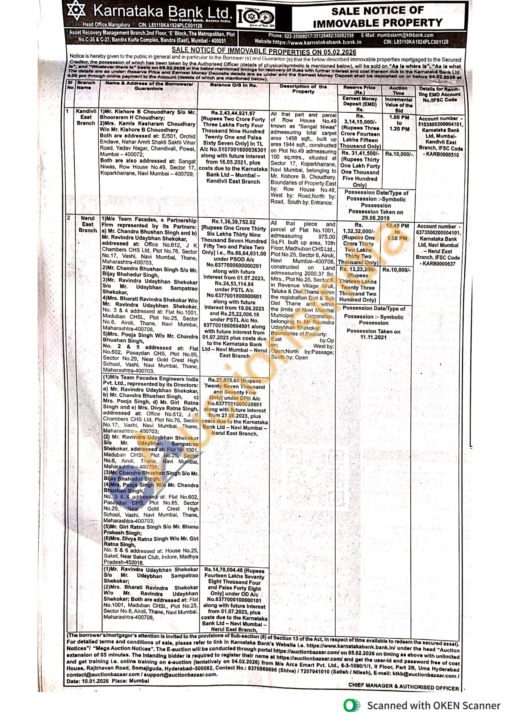 All that part and parcel of Row House No.49 known as "Sangat Niwas admeasuring total carpet area 1458 sqft., built up area 1944 sqft., constructed on Plot No.49 admeasuring 100 sq.mtrs., situated at Sector 17, Koparkhairane, Navi Mumbai, belonging to Mr. Kishore B. Choudhary. Boundaries of Property:East by: Row House No.48, West by: Road, North by: Road, South by: Entrance