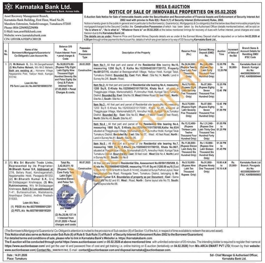 2) All that part and parcel of Residential Site, Assessment No.69/59/1/59/5/69, E-Khata No.152500600401020456, measuring 111.41 Sq.mt (1200.00 sq ft) (East to West-12.19 mtr & North to South-9.14 mtr), situated at Surya Puthra Layout, Near Neliganahalli-Sira Road, Pavagada Town, Tumakuru District, belonging to Mr. Bharath Kumar S.K. Boundaries of property as per Document: East: Same layout site No.62 and 61, West: Road, North: Same layout site No.70, South: Same layout site No.68.