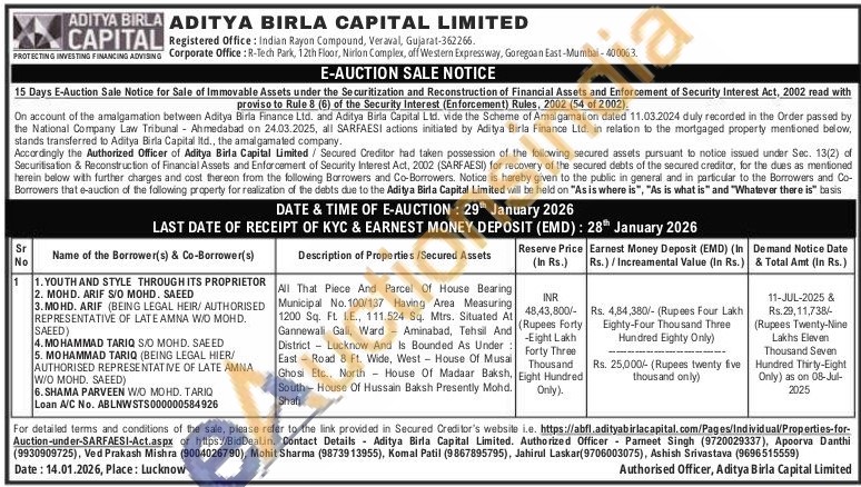 All That Piece And Parcel Of House Bearing Municipal No. 100/137 Having Area Measuring 1200 Sq. FL. LE., 111.524 Sq. Mtrs. Situated At Gannewali Gali, Ward Aminabad, Tehsil And District Lucknow And Is Bounded As Under East Road 8 Ft. Wide, West House Of Musai Ghosi Etc., North House Of Madaar Baksh, South House Of Hussain Baksh Presently Mohd. Shafi