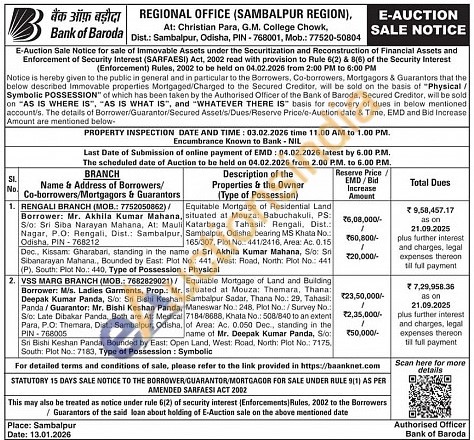 Equitable Mortgage of Residential Land situated at Mouza: Babuchakuli, PS Katarbaga. Tahasil: Rengali, Dist.: Sambalpur, Odisha, bearing MS Khata No. 165/307, Plot No.: 441/2416, Area: Ас. 0.15 Dec Kissam: Gharaban, standing in the name of Sri Akhila Kumar Mahana, Sio: Sn Sibanarayan Mahana, Bounded by East: Plot No.: 441, West: Road, North: Plot No: 441 (P), South: Plot No.: 440, Type of Possession : Physical