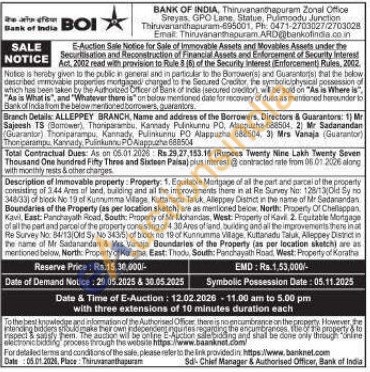 Description of Immovable property: Property: 1. Equitacle Mortgage of all the part and parcel of the property consisting of 3.44 Ares of land, building and all the improvements there in at Re Survey No: 128/13(Old Sy το 348/33) of block No 19 of of Kunnumma Village, Ruttanadu Tauk, Alleppey District in the name of Me Sadanandan Boundaries of the Property (as per location sketch) are as mentioned below North: Property Of Chellappan Kavi, East: Panchayath Road, South: Property of Mr Mohanian, West: Property of Kavi 2. Equtable Mongage of all the part and parcel of the property consisting of 4:30 Ares of land, buiding and all the improvements thereina
