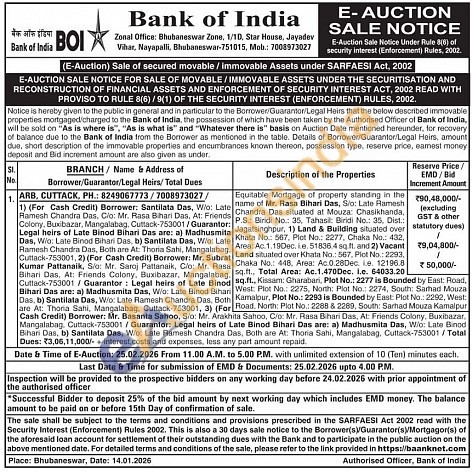 Equitable Mortgage of property standing in the name of Mr. Rasa Bihari Das, Sio: Late Ramesh Chandra Das situated at Mouza: Chasikhanda P.S.: Biridi No.: 35, Tahasi: Biridi No.: 35. Dist.:Jagatsinghpur, 1) Land & Building situated over Khata No: 567, Plot No.: 2277, Chaka No.: 432, Area: Ac. 1.19Dec. Le. 51836.41 4 sq ft. and 2) Vacant Land situated over Khata No.: 567. 567, Plot No.: 2293, Chaka No. 448. Area: Ac:0.28Dec. Le. 12196.8 5Q... Total Area: Ac.1.470Dec. I.e. 64033.20 sq.ft., Kissam: Gharabari Plot No.: 2277 is Bounded by East: Road, West: Plot No.: 2275, North: Plot No.: 2274, South: Sarhad Mouza Kamalpur, Plot No.: 2293 is Bounded by East: Plot No.: 2292, West: Road, North: Plot No.: 2288 & 2289, South: Sarhad Mouza Kamalpur