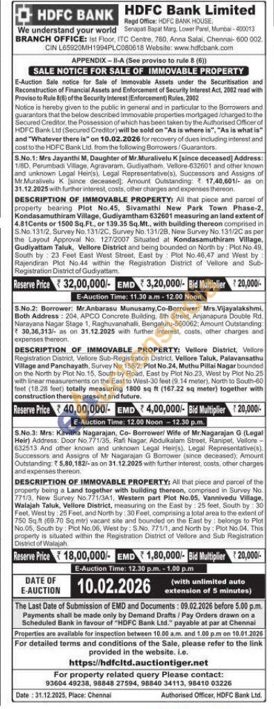 1) All that piece and parcel of property bearing Plot No.45, Sivamathi New Park Town Phase-2. Kondasamuthiram Village, Gudiyamtham 632601 measuring an land extent of 4.81Cents or 1500 Sq.Ft., or 139.35 Sq.Mt., with building thereon comprised in S.No. 131/2, Survey No. 131/2C, Survey No. 131/2B, New Survey No. 131/2C as per the Layout Approval No. 127/2007 Situated at Kondasamuthiram Village, Gudiyattam Taluk, Vellore District and being bounded on North by: Plot No.49, South by 23 Feet East West Street, East by Plot No.46,47 and West by Rajendiran Plot No.44 within the Registration District of Vellore and Sub-Registration District of Gudiyattam