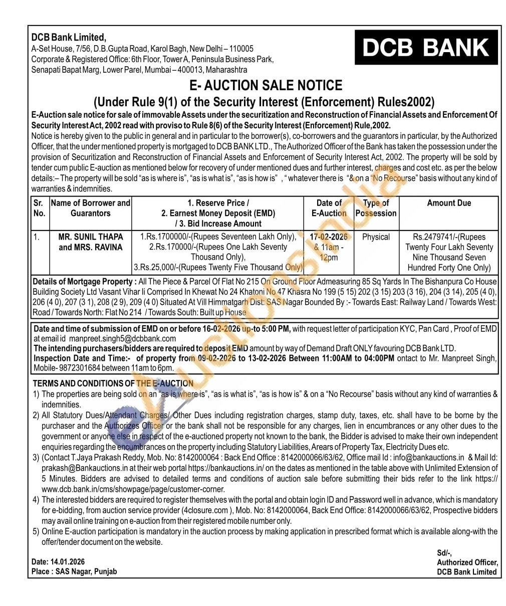 Details of Mortgage Property: All The Piece & Parcel Of Flat No 215 On Ground Floor Admeasuring 85 Sq Yards In The Bishanpura Co House Building Society Ltd Vasant Vihar li Comprised In Khewat No 24 Khatoni No 47 Khasra No 199 (515) 202 (315) 203 (316), 204 (314), 205 (40), 206 (40), 207 (31), 208 (29), 209 (40) Situated At Vill Himmatgarh Dist: SAS Nagar Bounded By:- Towards East: Railway Land/Towards West: Road/Towards North: Flat No 214/Towards South: Built up House
