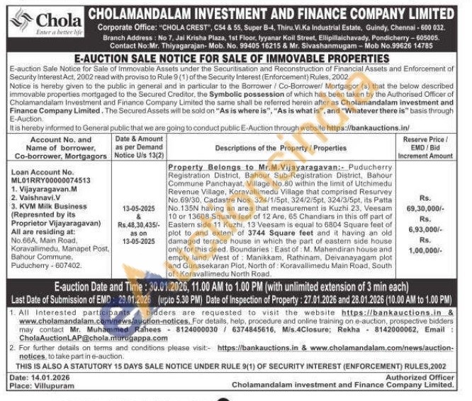 Property Belongs to Mr.M.Vijayaragavan:- Puducherry Registration District, Bahour Sub-Registration District, Bahour Commune Panchayat, Village No.80 within the limit of Utchimedu Revenue Village, Koravallimedu Village that comprised Resurvey No.69/30, Cadastre Nos. 324/1/5pt, 324/2/5pt, 324/3/5pt, its Patta No. 135N having an area that measurement is Kuzhi 23, Veesam 10 or 13608 Square feet of 12 Are, 65 Chandians in this off part of Eastern side 11 Kuzhi, 13 Veesam is equal to 6804 Square feet of plot to and extent of 3744 Square feet and it having an old damaged terrace house in which the part of eastern side house only for this deed. Boundaries: East of: M. Mahendiran house and empty land. West of Manikkam, Rathinam, Deivanayagam plot and Gunasekaran Plot, North of: Koravallimedu Main Road, South of: Koravallimedu North Road
