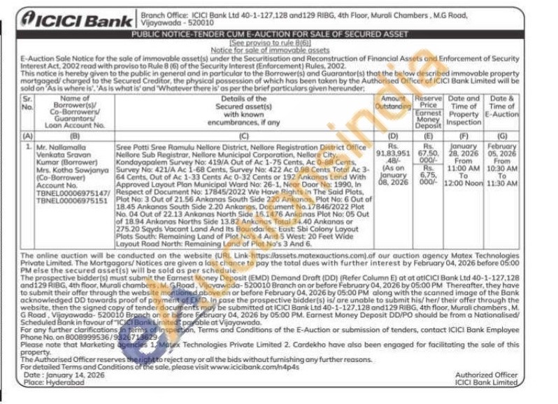 Sree Potti Sree Ramulu Nellore District, Nellore Flegistration District Office Nellore Sub Registrar, Nellore Municipal Corporation, Nellore City, Kondayapalem Survey No: 419/A Out of Ac 1-75 Cents, Ac 0-88 Cents, Survey No: 421/A Ac 1-68 Cents, Survey No: 422 Ac 0.98 Cents Total Ac 3-64 Cents. Out of Ac 1-33 Cents Ac 0-32 Cents or 192 Ankanas Land With Approved Layout Plan Municipal Ward No: 26-1, Near Door No: 1990, In Respect of Document No: 17845/2022 We Have Rights in The Said Plots, Plot No: 3 Out of 21.56 Ankanas South Side 220 Ankanos, Plot No: 6 Out of 18.45 Ankanos South Side 2.20 Ankanas, Document No. 17846/2022 Plot No. 04 Out of 22.13 Ankanas North Side 16.1476 Ankanas Plot No: 05 Out of 18.94 Ankonas Norths Side 13.82 Ankanas Total 34.40 Ankanas or 275.20 Sqyds Vacant Land And Its Boundaries: East: Sbi Colony Layout Plots South: Remaining Land of Plot No's 4 And 5 West: 20 Feet Wide Layout Road North: Remaining Land of Plot No's 3 And 6