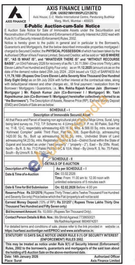 All that Piece and Parcel of bearing non agricultural plot of land in Moje Umra, Surat, Iying being land survey no. 71/2, TP. Scheme no. 4 (Umra South), F. P. no. 80 Palkki, Sub Plot no. 11-8, 12-C, respectably admeasuring 420.16 Sq. Mtrs. & 566.00 Sq. mtrs, known as "Ashirwad Complex paikki Third Floor, Flat No. 306, Super-Built-Up, admeasuring 1420.00 Sq. fts, Built up admeasuring 99.00 Sq. mtrs., Undivided Share of Land admeasuring 54.23 Sq. mtrs. Registration District & Sub-District Surat within the State of Gujarat and bounded as under (said property"/"property-2"). East-By 25fts. Road, North-By R. S. No. 71/2 Paikki Plot No. 9/C & 10/A, West-By Umra R. S. No 75 Paikki, South-By Umra R. S. No. 71/3 Land.