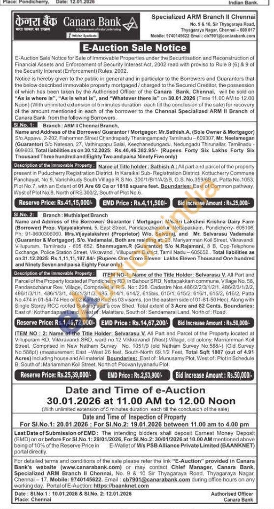ITEM NO: 2: Name of the Title Holder: Selvarasu V. All Part and Parcel of the Property located at Villupuram RD, Vikkravandi SRD, ward no.12 Vikkravandi (West) Village, old colony, Marriamman Koil Street. Comprised in New Natham Survey No. 1051/9 (old Natham Survey No.588-) (Old Survey No.588pt) (measurement East-West 25 feet, South-North 69.1/2 Feet, Total Sqft 1807 (out of 4.91 Acres) Including house and All material. Boundaries: East of Munusamy Plot, West of: Plot in Schedule B. South of: Mariamman Koil Street, North of Poovan lyyanarlu Plot.