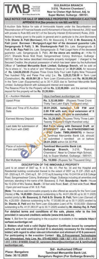 Land to an extent of 3947 sq. ft. in S. No. 41, Plot No. 34 and the Hospital and Residential building constructed thereat to the extent of 9557 sq. ft (CF-2520 sq.ft. GF-2520 sq.ft. FF-2345 sq.ft, SF-2172 sq ft) bearing H.No. 10-2/41/34 at S.B.College Road, Sangameshwar Colony, Brahampur Village, Gulbarga including all amenities and services, standing in the name of Mr. Basavaraj S. Patil. Boundaries: North: House No. 10-2/34 of Mrs. Tarabai. South: 30 feet wide Road, East: 25 feet wide Road. West Open plot and house of Mr. S.S. Patil