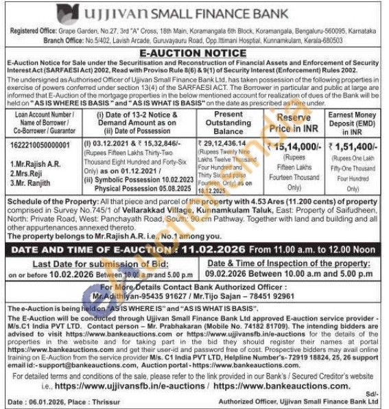 Schedule of the Property: All that piece and parcel of the property with 4.53 Ares (11.200 cents) of property comprised in Survey No.745/1 of Vellarakkad Village, Kunnamkulam Taluk, East: Property of Saifudheen, North: Private Road, West: Panchayath Road, South: 90 cm Pathway. Together with land and building and all other appurtenances annexed thereto.