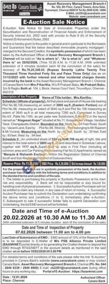 Name of Title holder: Mrs.Kavitha: Schedule I (Whole of property): All that piece and parcel of House site bearing Plot No 98,106 measuring an extent of 2805 sq.ft., (Eastern Portion) out of Plot No.98, measuring an extent of 3640 sq.ft and Plot No. 106 measuring an extent of 3640 sq.ft in all total measuring 7280 sq ft., Comprised in Survey No.4/2 Patta No.1160, as per patta new Subdivision S.No.4/12. in the layout named as "Alagesan Nagar" situated at No: 11, Kolapakkam Village, Vandalur Taluk, Chengalpattu District. Bounded on the: North by: 24 Feet Road, South by: Vacant Land, East by Plot No.99, West by: Plot belonging to Mr. Rajaram & Mr. Yuvaraj. Measuring on the: North by: 30 feet. South by: 30 feet, East by: 93 feet. West by: 94 feet.