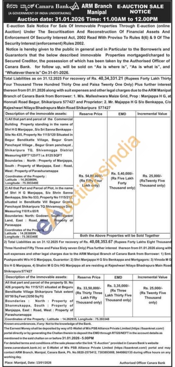 1) All that part and parcel of the Commercial Building Property standing in the name of Shri H G Manjappa, S/o Sri Sanna Benkappa-Site No 435, Property No 1115/120 Situated in Begur Bendikatte Village, Begur Gram Panchayat Village, Begur Gram panchayat, Shikaripura TQ, Shivamogga District Measuring 65FT 125 FT i.e. 8125 SQFT