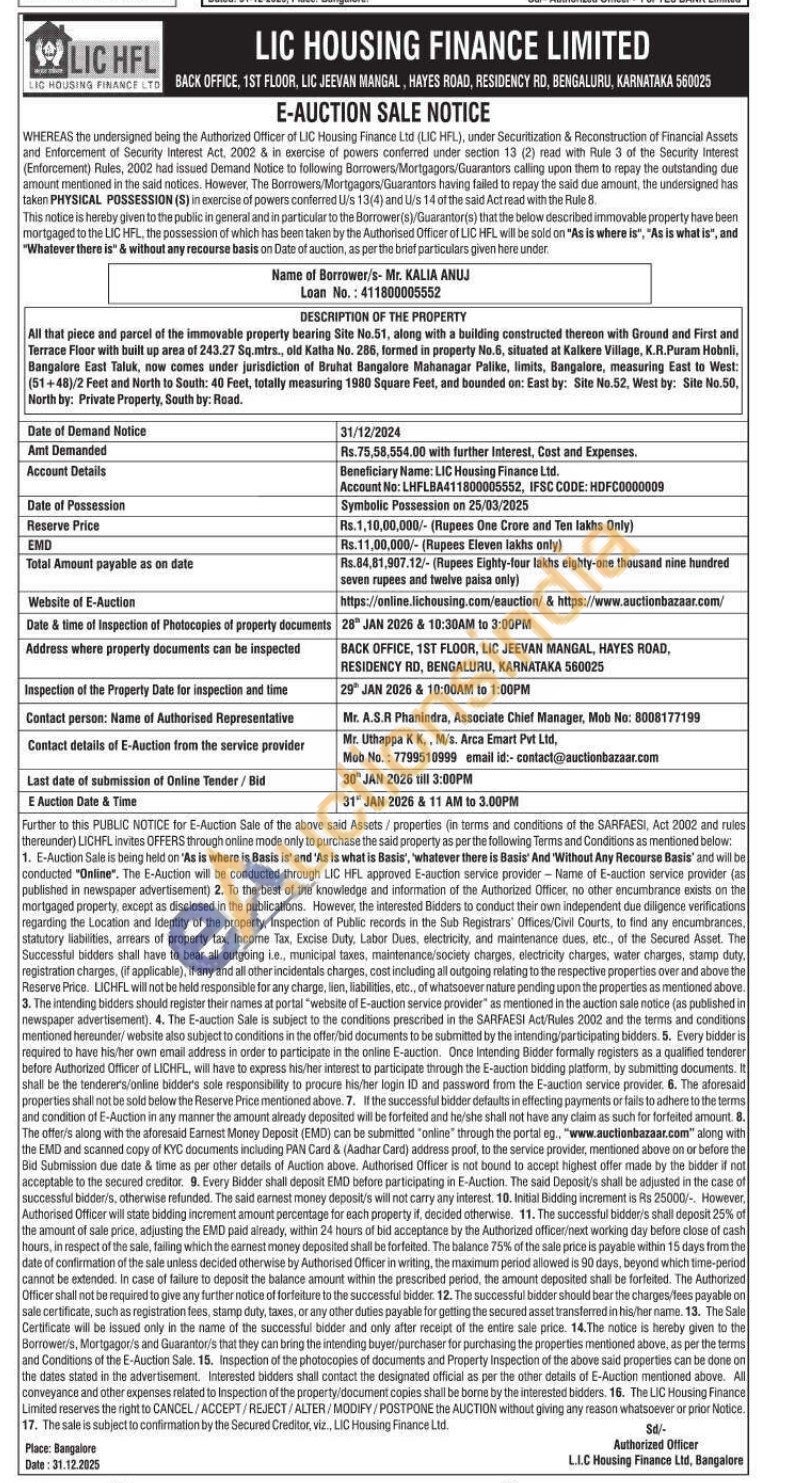 All that piece and parcel of the immovable property bearing Site No.51, along with a building constructed thereon with Ground and First and Terrace Floor with built up area of 243.27 Sq.mirs. mtrs., old Katha No. 286, formed in property No.5, situated at Kalkere Village, K.R.Puram Hobali, Bangalore East Taluk, now comes under jurisdiction of Bruhat Bangalore Mahanagar Palike, limits, Bangalore, measuring East to West: (51+48)/2 Feet and North to South: 40 Feet, totally measuring 1980 Square Feet, and bounded on: East by: Site No.52, West by: Site No.50, North by: Private Property, South by: Road.
