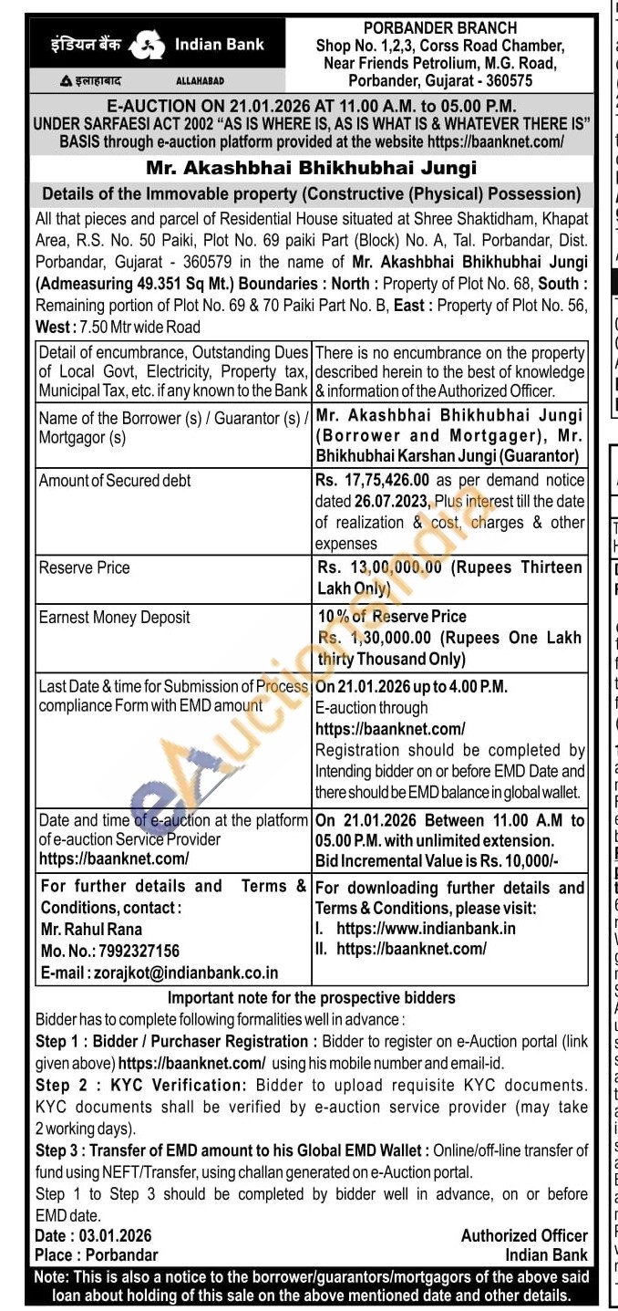 All that pieces and parcel of Residential House situated at Shree Shaktidham, Khapat Area, R.S. No. 50 Paiki, Plot No. 69 paiki Part (Block) No. A, Tal. Porbandar, Dist. Porbandar, Gujarat 360579 in the name of Mr. Akashbhai Bhikhubhai Jungi (Admeasuring 49.351 Sq Mt.) Boundaries: North: Property of Plot No. 68, South: Remaining portion of Plot No. 69 & 70 Paiki Part No. B, East: Property of Plot No. 56, West: 7.50 Mtr wide Road