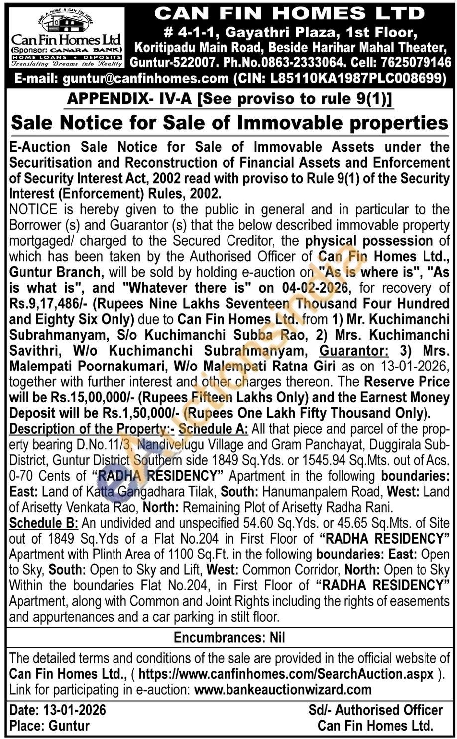 Description of the Property:- Schedule A: All that piece and parcel of the prop-erty bearing D.No. 11/3, Nandivelugu Village and Gram Panchayat, Duggirala Sub-District, Guntur District Southern side 1849 Sq. Yds. or 1545.94 Sq.Mts. out of Acs. 0-70 Cents of "RADHA RESIDENCY" Apartment in the following boundaries: East: Land of Katta Gangadhara Tilak, South: Hanumanpalem Road, West: Land of Arisetty Venkata Rao, North: Remaining Plot of Arisetty Radha Rani.