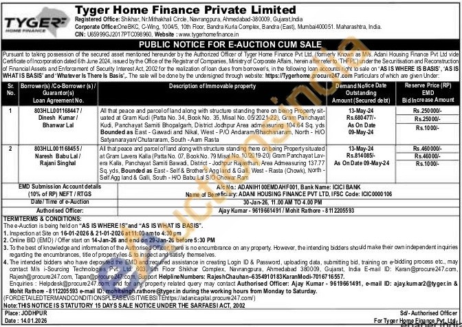 All that peace and parcel of land along with structure standing there on being Property sit-uated at Gram Kudi (Patta No. 34, Book No. 35, Misal No. 05/2021-22), Gram Panchayat Kudi, Panchayat Samiti Bhopalgarh, District Jodhpur Area admeasuring 104.64 Sq. yds Bounded as East-Gawadi and Nikal, West-P/O Andaram/Bhachanaram, North-H/O Satyanarayan/Chutararam, South-Aam Rasta