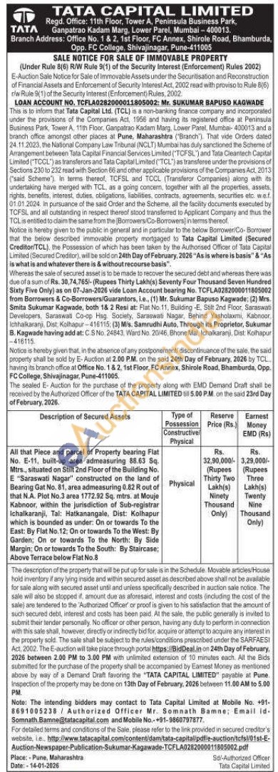 All that Piece and parcel of Property bearing Flat No. E-11, built-up area admeasuring 88.63 Sq. Mtrs., situated on Stiit 2nd Floor of the Building No. E "Saraswati Nagar" constructed on the land of Bearing Gat No. 81, area admeasuring 0.82 R out of that N.A. Plot No.3 area 1772.92 Sq. mtrs. at Mouje Kabnoor, within the jurisdiction of Sub-registrar Ichalkaranji, Tal: Hatkanangale, Dist: Kolhapur which is bounded as under: On or towards To the East: By Flat No.12: On or towards To the West: By Garden; On or towards To the North: By Side Margin: On or towards To the South: By Staircase; Above Terrace below Flat No.8