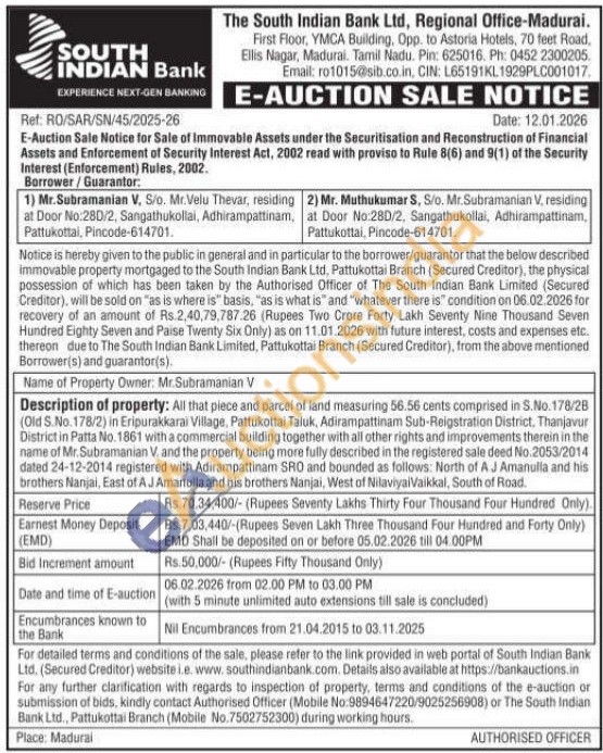 Description of property: All that piece and parcel of land measuring 56.56 cents comprised in S.No. 178/28 (Old S.No. 178/2) in Eripurakkarai Village, Pattukottai Taluk, Adirampattinam Sub-Reigstration District. Thanjavur District in Patta No. 1861 with a commercial building together with all other rights and improvements therein in the name of Mr. Subramanian V. and the property being more fully described in the registered sale deed No.2053/2014 dated 24-12-2014 registered with Adirampattinam SRO and bounded as follows: North of A J Amanulla and his brothers Nanjai, East of AJ Amanulla and his brothers Nanjai, West of Nilaviyai Vaikkal, South of Road
