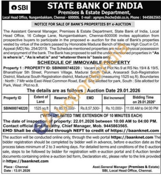 Property 1: PROPERTY ID: SBIN000748220: Vacant plot at Plot No.9 at RS No. 19/4 & 19/5, Bharathiyar 5th Street, Ponmeni Village, Madurai South Taluk, Arasaradi Sub-Registration District, Madurai South Registration district, Madurai District (measuring 1525 sq.ft). Boundaries North: 7 Mtr wide East-West Common Road, East: Site allotted for park, South: Site allotted for Park, West: Plot no.8