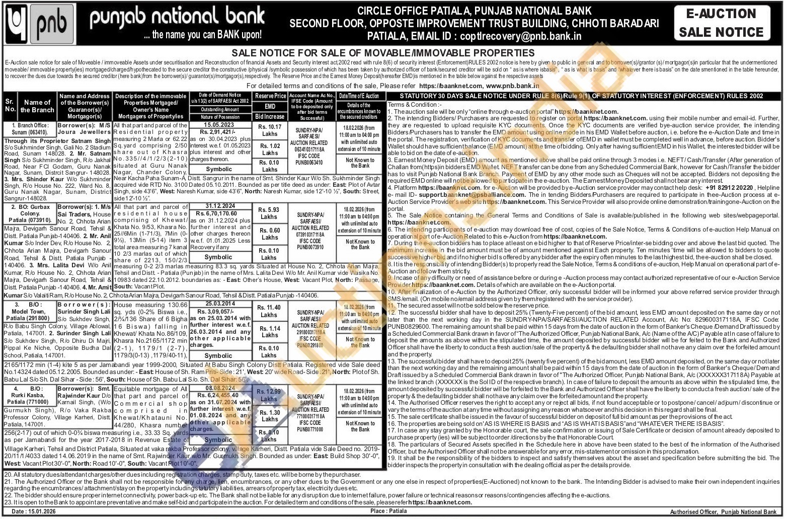 All that part and parcel of the Residential property measuring 2 Marla or 62.22 Sq.yard comprising 2/50 share out of Khasra No.335//4/1/2/3(2-10) situated at Guru Nanak Nagar, Chander Colony Near Kacha Paha Sunam-A Distt Sangrur in the name of Smt Shinder Kaur W/o Sh. Sukhminder Singh acquired vide RTD No. 3100 Dated 05.10.2011. Bounded as per title deed as under: East: Plot of Avtar Singh, side 43'6", West: Naresh Kumar, side 43'6", North: Naresh Kumar, side 12'-10 ½", South: Street side 12'-10 1/2"