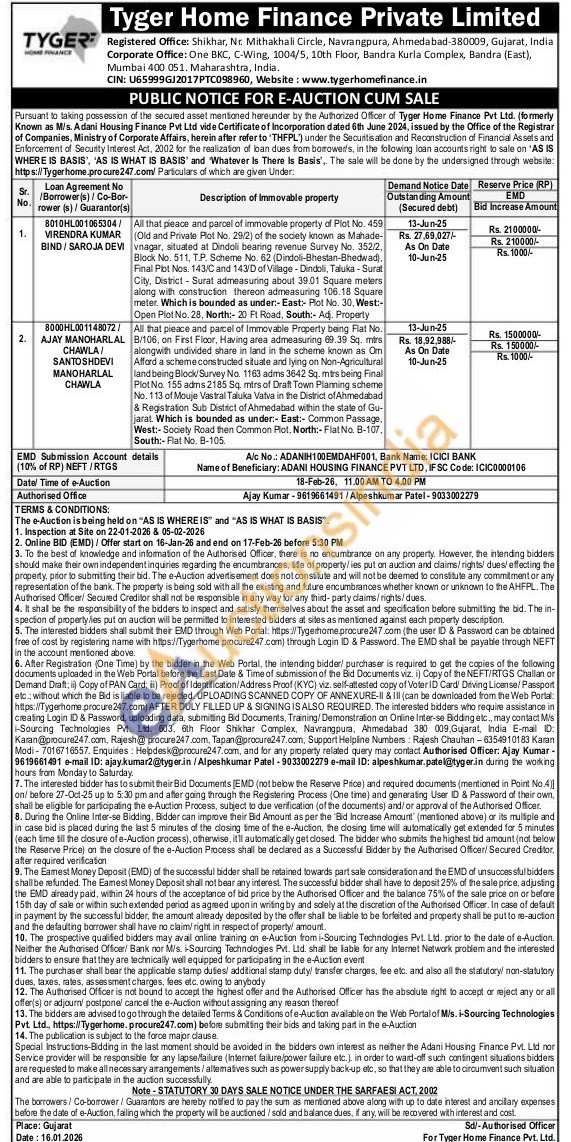 All that pieace and parcel of immovable property of Plot No. 459 (Old and Private Plot No. 29/2) of the society known as Mahade-vnagar, situated at Dindoli bearing revenue Survey No. 352/2, Block No. 511, T.P. Scheme No. 62 (Dindoli-Bhestan-Bhedwad), Final Plot Nos. 143/C and 143/D of Village - Dindoli, Taluka - Surat City, District - Surat admeasuring about 39.01 Square meters along with construction thereon admeasuring 106.18 Square meter. Which is bounded as under:- East:- Plot No. 30, West:-Open Plot No. 28, North: 20 Ft Road, South:- Adj. Property