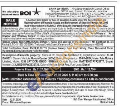 Description of Movable property: Name of RC Owner: Mr.Santhosh R, Registration Number: KL 01 DA 8011, Class of Vehicle Goods Carrier (MGV), Date of Registration: 17-01-2024, Make. Tata Motors Limited, Model: 1216 LPT DCR 45HSD 160B6M6, Chassis Number: MAT785007P7P25777, Engine Number: 3.3LNGD11PWX532735, Color of Vehicle: Brick Red, Fuel Used: Diesel