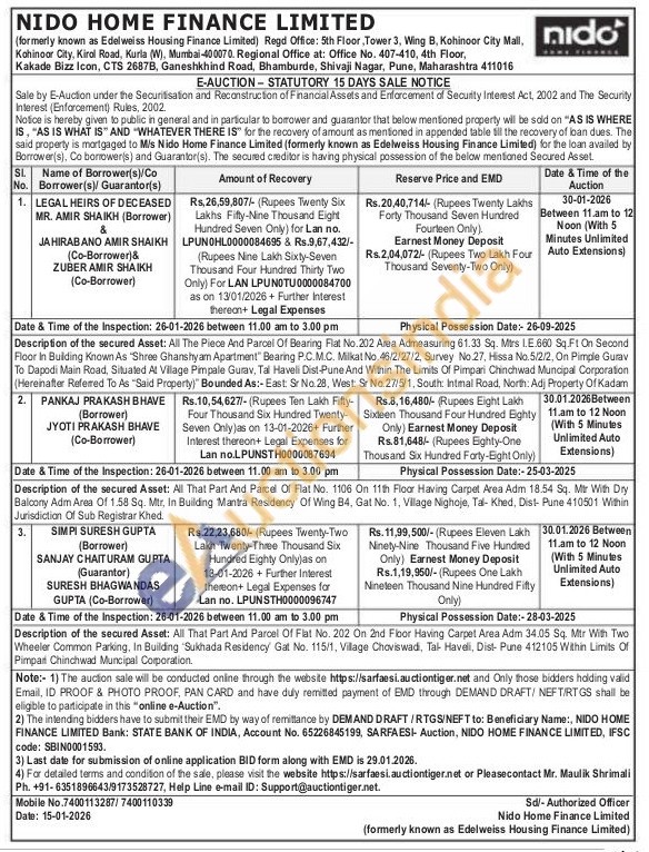 Description of the secured Asset: All The Piece And Parcel Of Bearing Flat No.202 Area Admeasuring 61.33 Sq. Mtrs 1.E.660 Sq.Ft On Second Floor In Building Known As "Shree Ghanshyam Apartment" Bearing P.C.M.C. Milkat No. 46/2/27/2, Survey No.27, Hissa No. 5/2/2, On Pimple Gurav To Dapodi Main Road, Situated At Village Pimpale Gurav, Tal Haveli Dist-Pune And Within The Limits Of Pimpari Chinchwad Muncipal Corporation (Hereinafter Refered To As "Said Property)" Bounded As:-East: Sr No.28, West: Sr No.27/5/1, South: Intmal Road, North: Adj Property Of Kadam