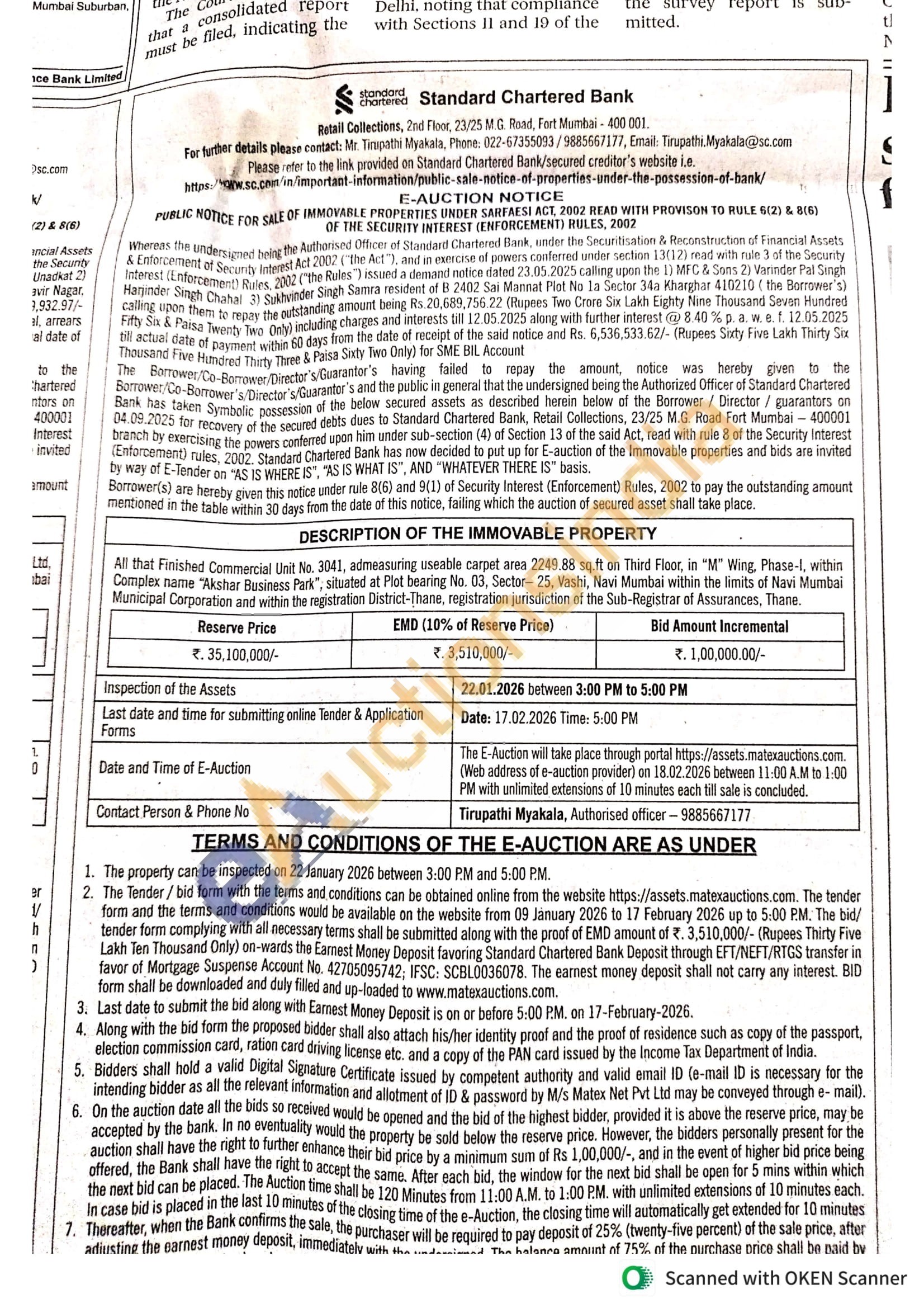 All that Finished Commercial Unit No. 3041, admeasuring useable carpet area 2249.88 sq.ft on Third Floor, in "M" Wing, Phase-I, within Complex name "Akshar Business Park", situated at Plot bearing No. 03, Sector-25, Vashi, Navi Mumbai within the limits of Navi Mumbai Municipal Corporation and within the registration District-Thane, registration jurisdiction of the Sub-Registrar of Assurances, Thane
