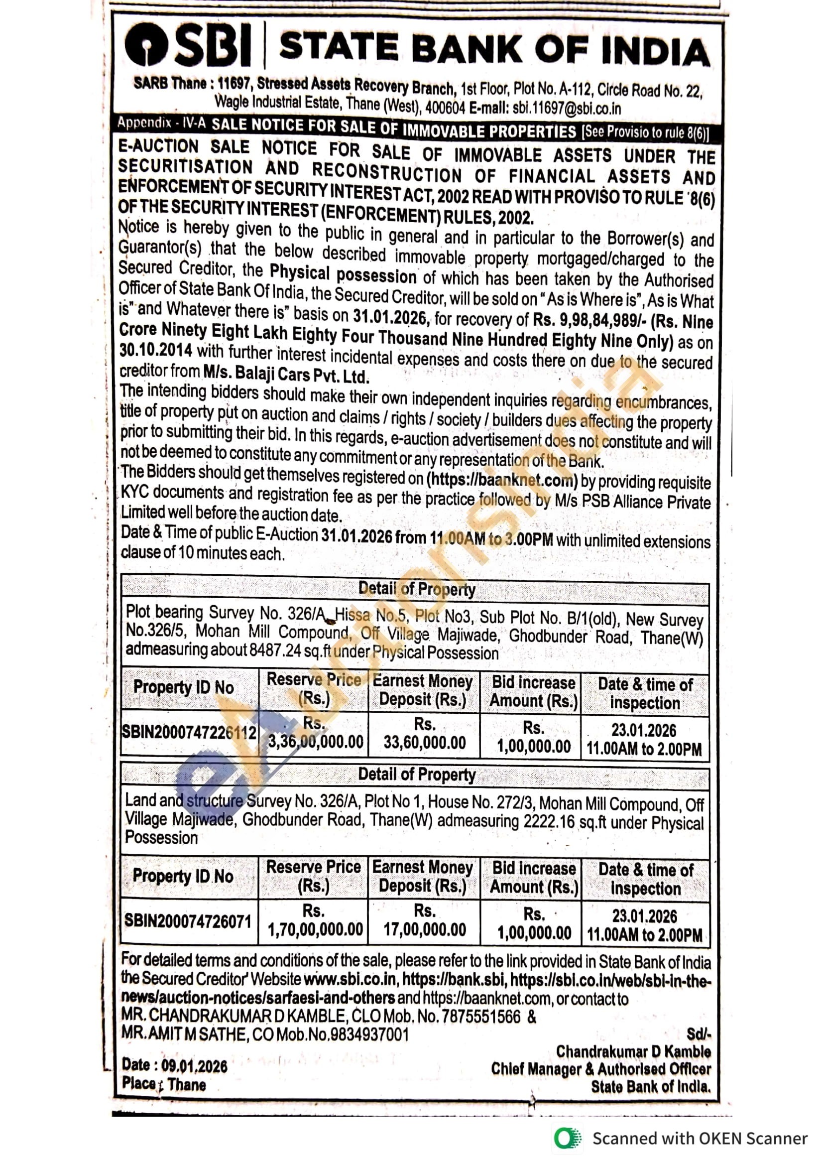 Land and structure Survey No. 326/A, Plot No 1, House No. 272/3, Mohan Mill Compound, Off Village Majiwade, Ghodbunder Road, Thane (W) admeasuring 2222.16 sq.ft under Physical Possession