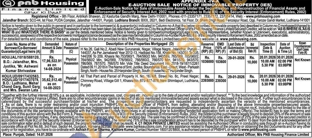 H No.26, Gali No.2, Abadi New Gurunanak, Nagar, Village Nagra, Jalandhar, Punjab 144037, As Per Jamabandi Year 2012-13, Hadbast No. 158, Khata No. 143/201 To 205, 144/206 To 209, Khasra No.753/560/1, 764/560/2 Min, 940/569, 765/569, 785/560/2, 764/560/2 Min, 942/569, 776/560/2, 766/560/2, 766/570 Min, 941/570, 943/570, 786/569, 787/570, 766/570 Min Vide Title Deed Document No. 2018-19/187/1/2261 Dated 09.11.2018 in The Name of Smt. Jyotika. Boundaries: East-Street, West-Parkash Singh, North-House No. 25 Harpinder Singh, South-House No.27 Harpinder Singh
