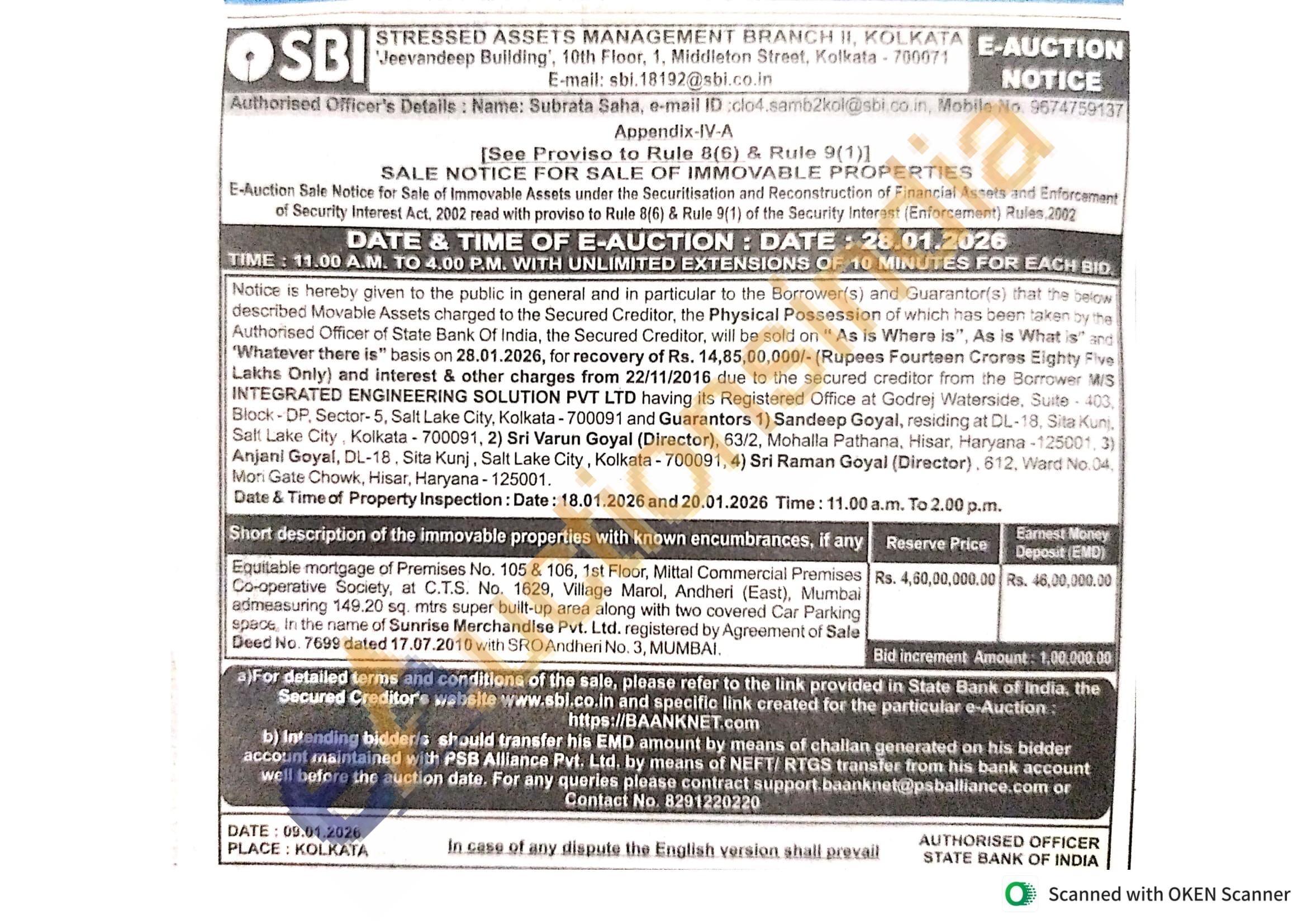 Equitable mortgage of Premises No. 105 & 106, 1st Floor, Mittal Commercial Premises Co-operative Society, at C.T.S. No. 1629, Village Marol, Andheri (East), Mumbai admeasuring 149.20 sq. mtrs super built-up area along with two covered Car Parking space, In the name of Sunrise Merchandise Pvt. Ltd. registered by Agreement of Sale Deed No. 7699 dated 17.07.2010 with SRO Andheri No. 3, MUMBAI