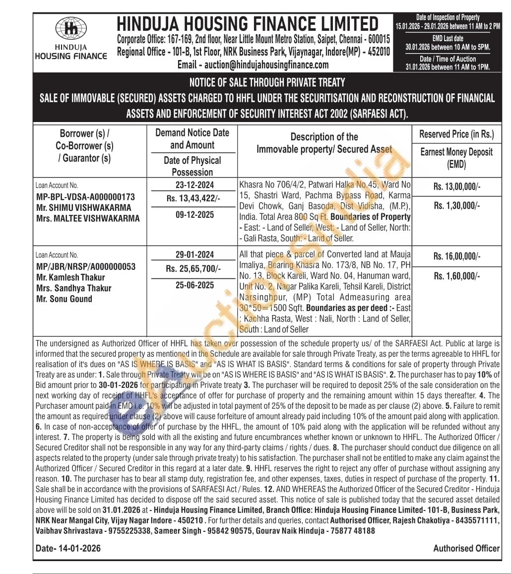 Authorised Officer, Rajesh Chakotiya - 8435571111, Vaibhav Shrivastava - 9755225338, Sameer Singh-9584290575, Gourav Naik Hinduja - 75877 48188