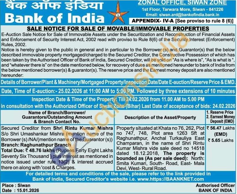 Property situated at Khata no 76, 262, Plot no 747, 748, Plot area 1263 Sft at Raghunathpur, Anchal Turkauliya East Champaran, in the name of Shri Rintu Kumar Mishra vide sale deed no 14518 dated 18.12.2018, The property is bounded as (As per sale deed): North: Smita Kumari, South- Road, East- Mala Devi, West-Rural Road.