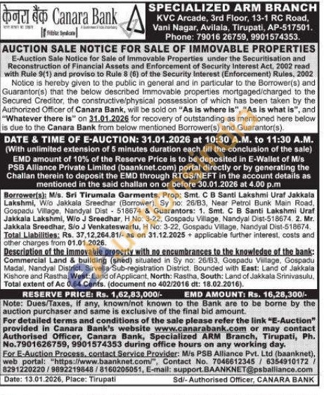 Commercial Land & building (shed) situated in Sy no: 26/83, Gospadu Village, Gospadu Madal, Nandyal District, Sirvella Sub-registration District. Bounded with East: Land of Jakkala Kishore and Rastha, West: Land of Applicant, North: Rastha, South: Land of Jakkala Srinivasulu, Total extent of Ac 0.64 Cents. (document no 402/2016 dt: 18.02.2016)